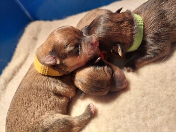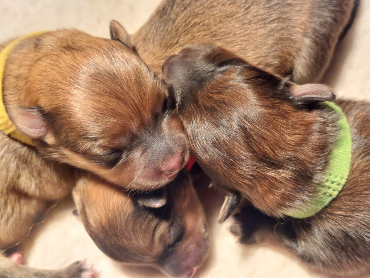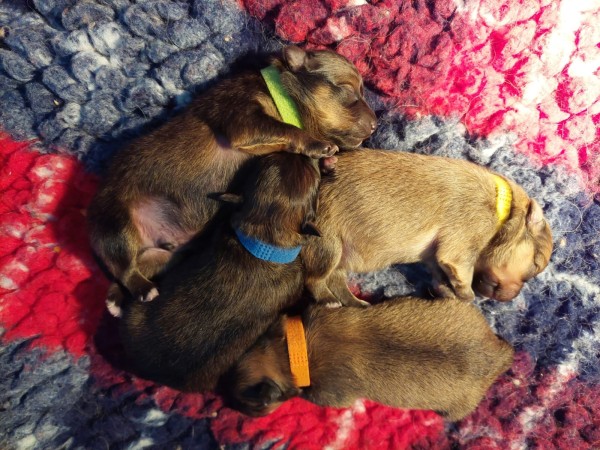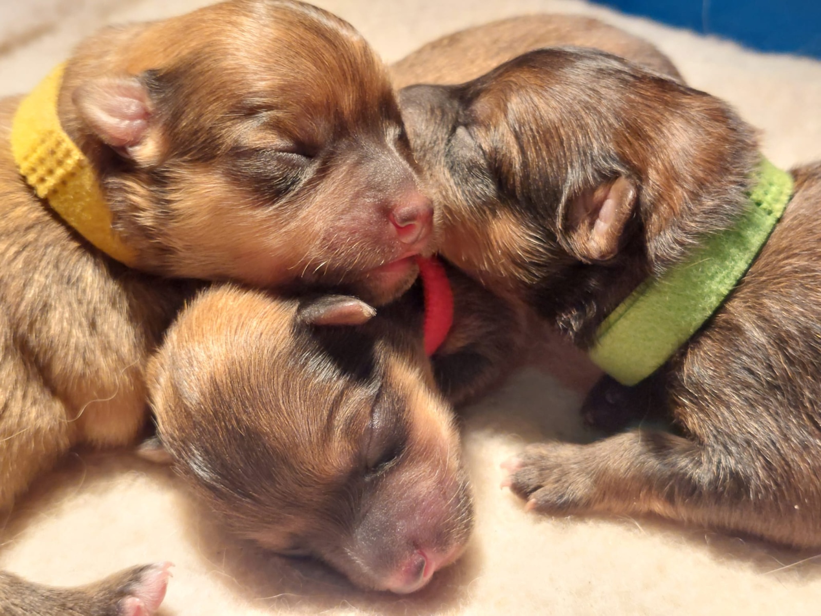 Het nest bestaat uit twee reutjes en twee teefjes. Alle pups waren bij de geboorte sterk en gezond.