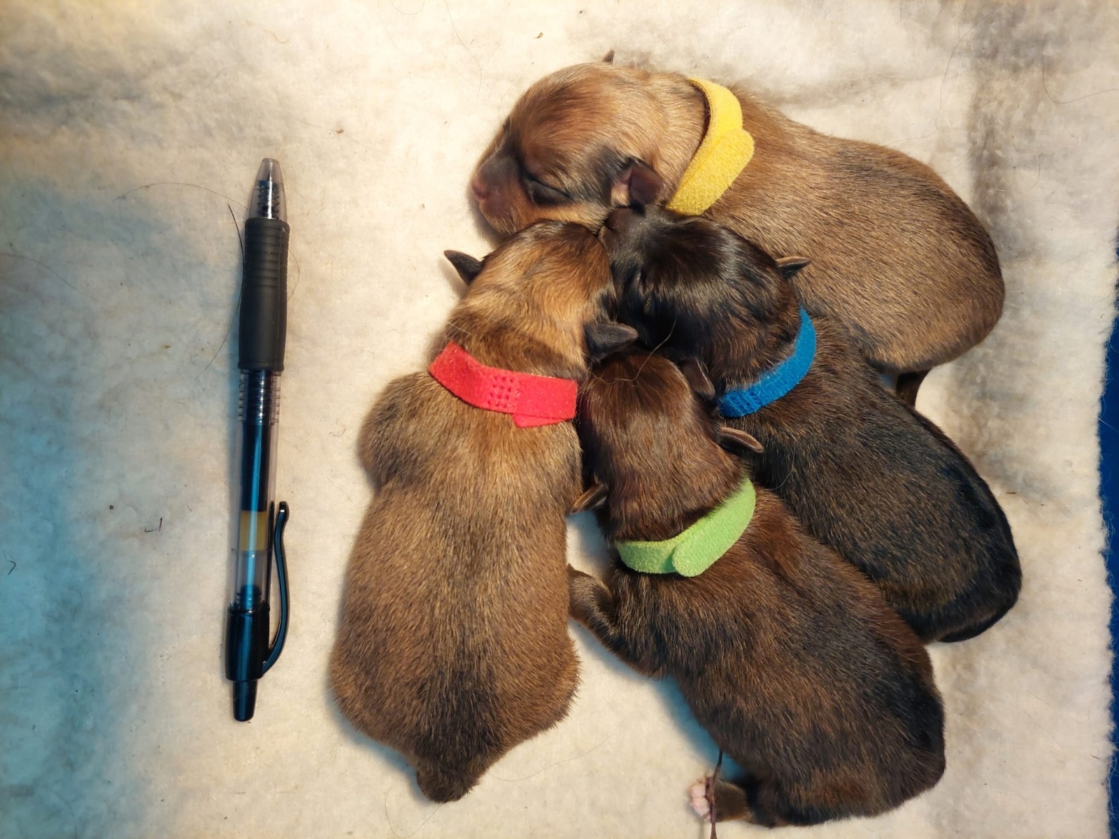 Het nest bestaat uit twee reutjes en twee teefjes. Alle pups waren bij de geboorte sterk en gezond.