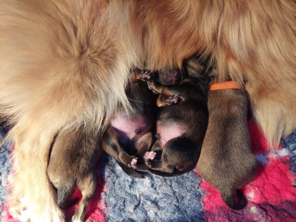 Inmiddels zijn de pups 12 dagen oud en groeien ze mooi door. Ze drinken goed en moeder zorgt uitstekend voor haar kleintjes.